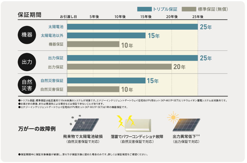 先ほどの単元でお伝えした通り、太陽光メーカー側に自然災害補償が付帯されているのは京セラしかありません。
